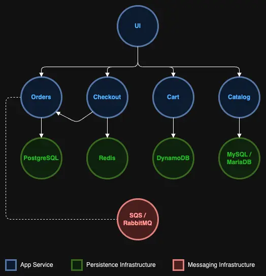 このワークショップのほとんどのラボでは、演習中に作業できる実際のコンテナコンポーネントを提供する共通のサンプルアプリケーションを使用しています。サンプルアプリケーションは、顧客が商品カタログを閲覧し、カートにアイテムを追加し、チェックアウトプロセスを通じて注文を完了できる単純なウェブストアをモデル化しています。